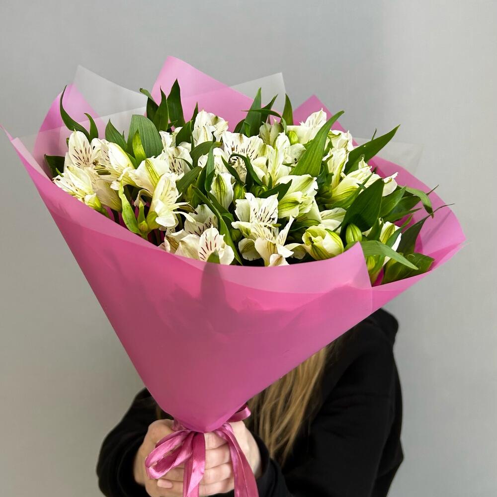 Лента атласная – 2 шт.Альстромерия – 11 шт.Упаковка дизайнерская – 2 шт.Зелень – 2 шт.