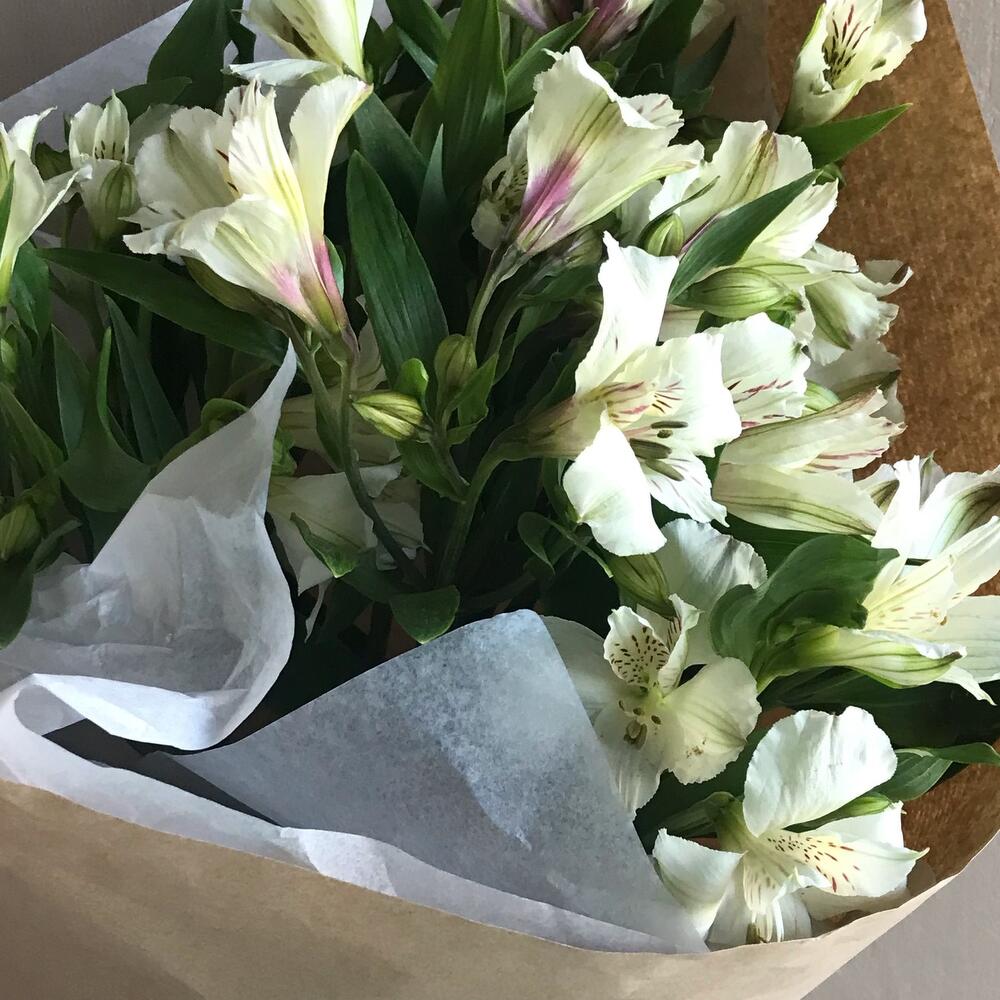 Альстромерия – 7 шт.Лента атласная – 1 шт.Тишью – 1 шт.крафт однотонный – 1 шт.