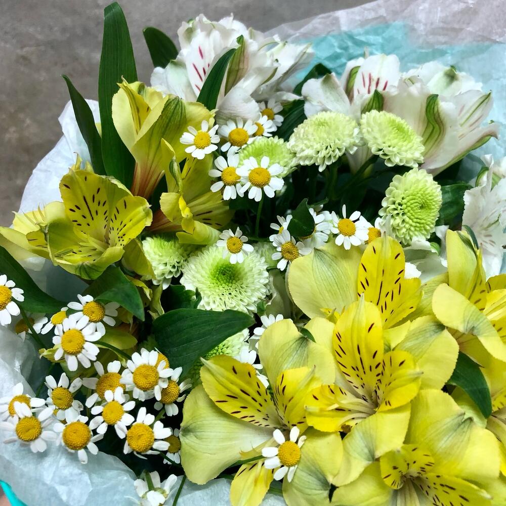 Альстромерия – 5 шт.Матрикария – 2 шт.Сантини – 2 шт.Упаковка дизайнерская – 2 шт.Лента атласная – 2 шт.