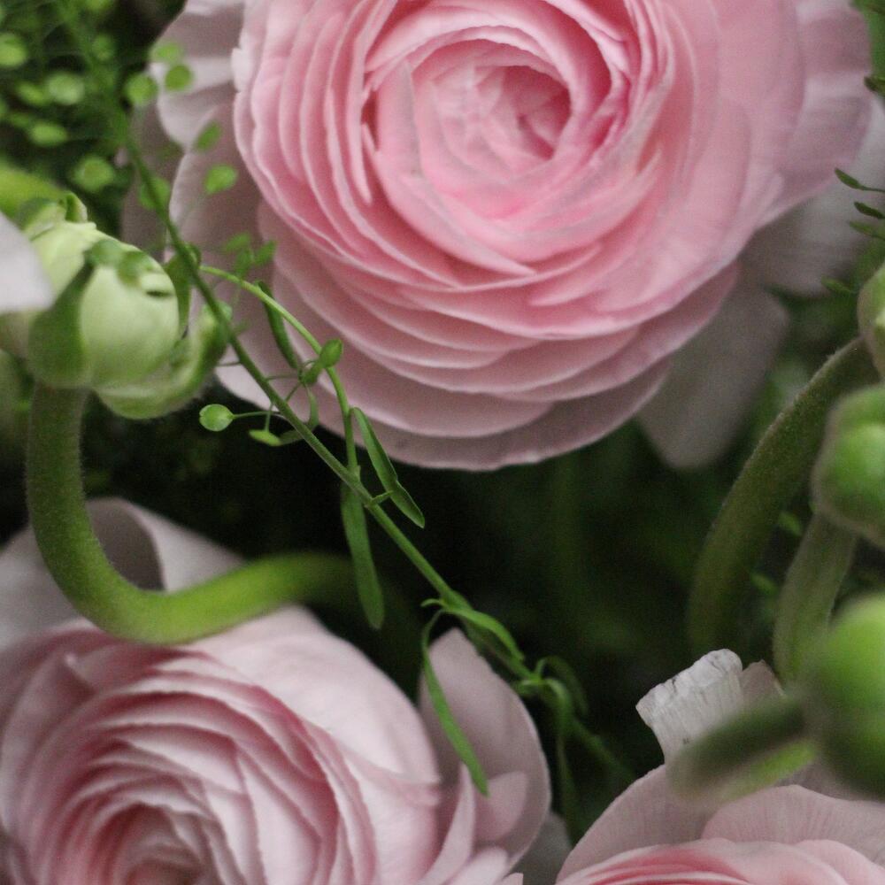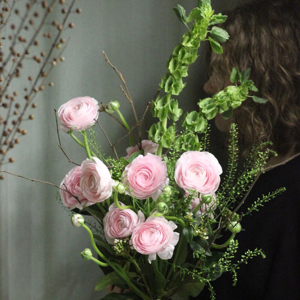 Букет с нежными ранункулюсами, ирландскими колокольчиками, ветвями и пастушьей сумкой.