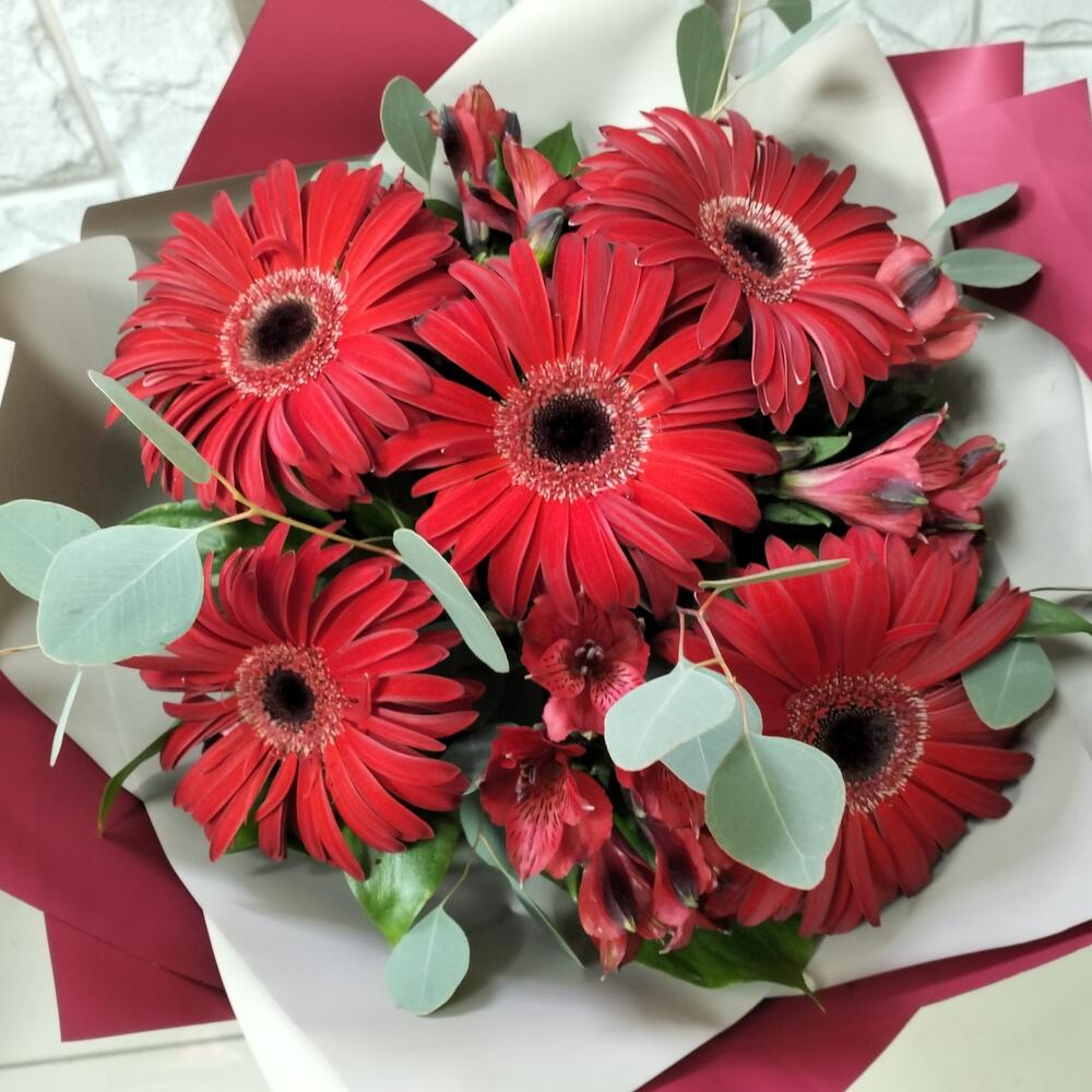 Эвкалипт Популус – 3 шт.Лента атласная – 1 шт.Гербера красная – 5 шт.Альстромерия Микс Европа – 3 шт.Упаковка калька флористическая – 2 шт.