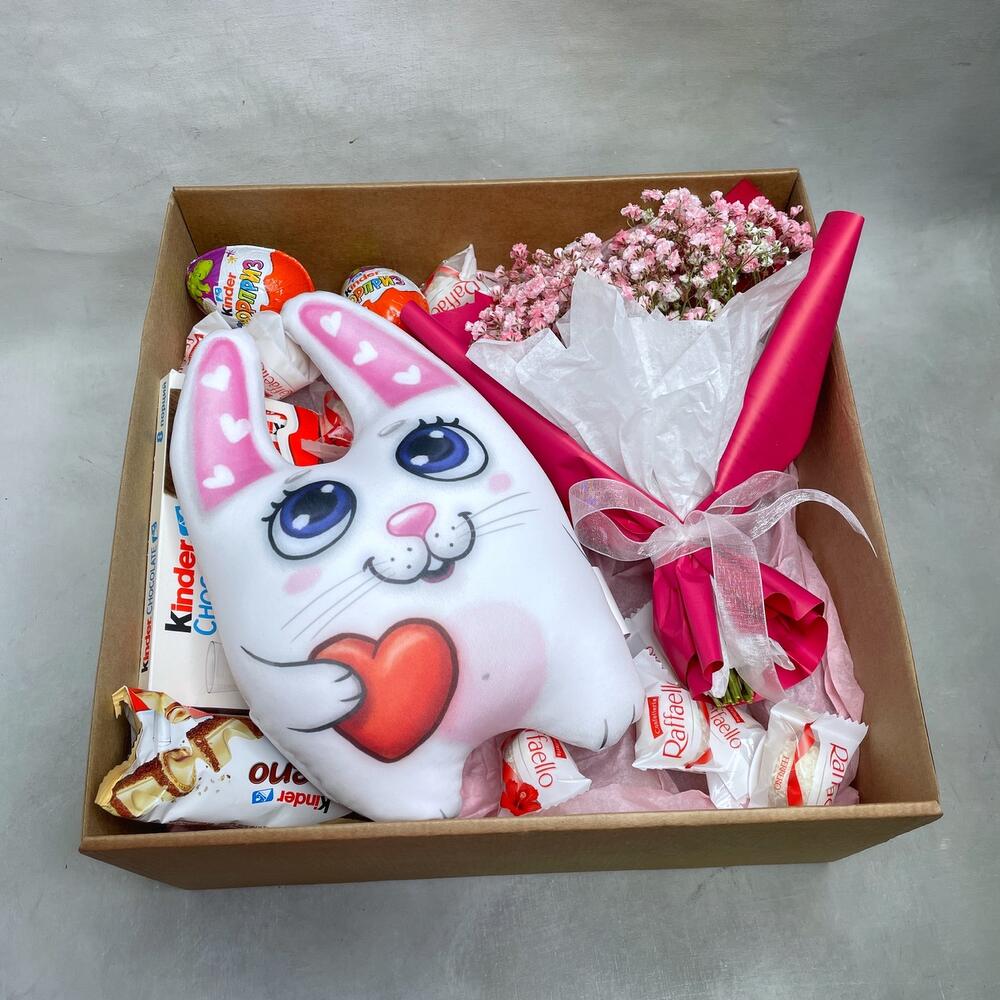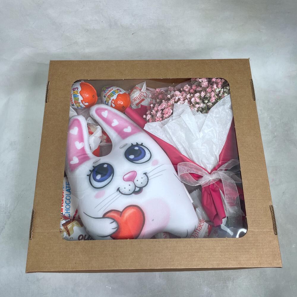 Гипсофила – 3 шт.Упаковка – 1 шт.Kinder bueno – 1 шт.Kinder сюрприз – 2 шт.Kinder chocolate – 1 шт.коробка крафт с окошком – 1 шт.игрушка заяц-антистресс – 1 шт.