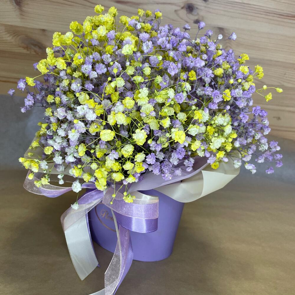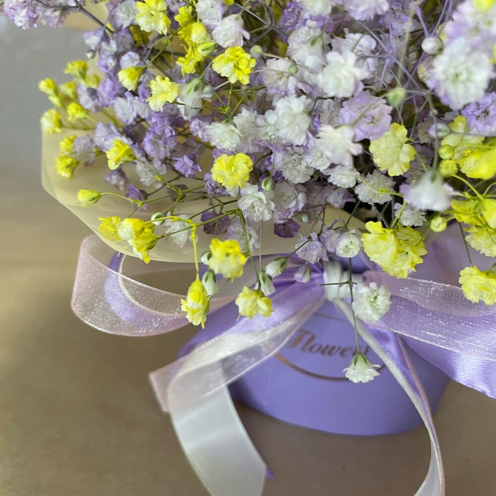 “Сиреневый туман” – композиция из гипсофилы в шляпной коробке