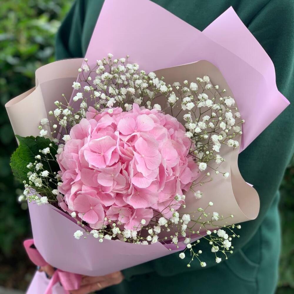 Гортензия розовая – 1 шт.Гипсофила – 1 шт.Упаковка дизайнерская – 1 шт.Лента атласная – 1 шт.