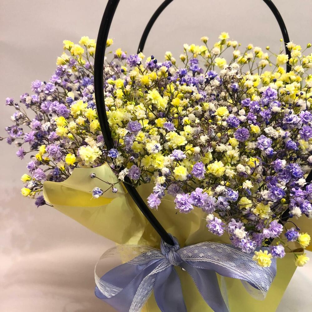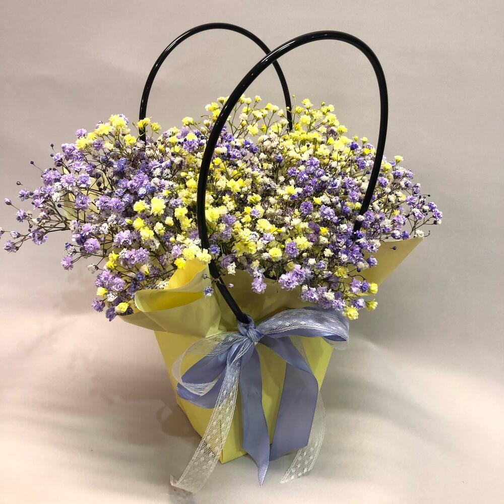 “Сиреневый туман” – композиция из гипсофилы в шляпной коробке