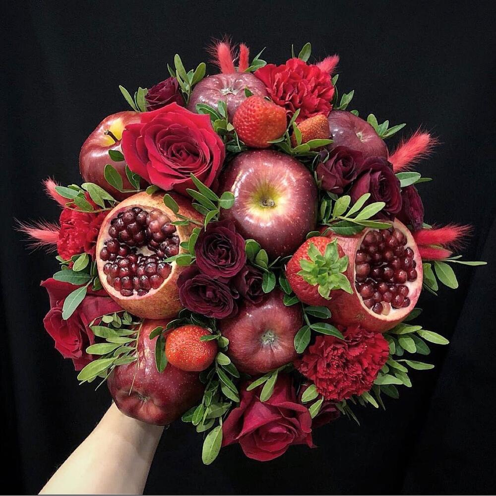 Яблоко – 12 шт.Гранат – 3 шт.Клубника – 6 шт.розы – 4 шт.гвоздики – 4 шт.розы кустовые – 5 шт.зелень фисташки – 3 шт.