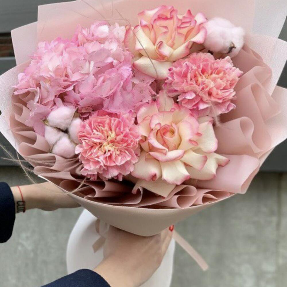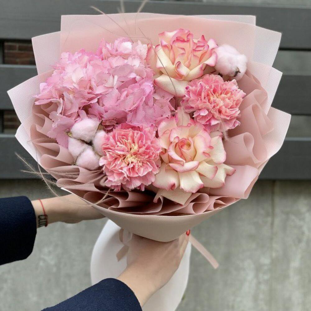 Гвоздики, Лизиантусы, Розы, Тюльпаны