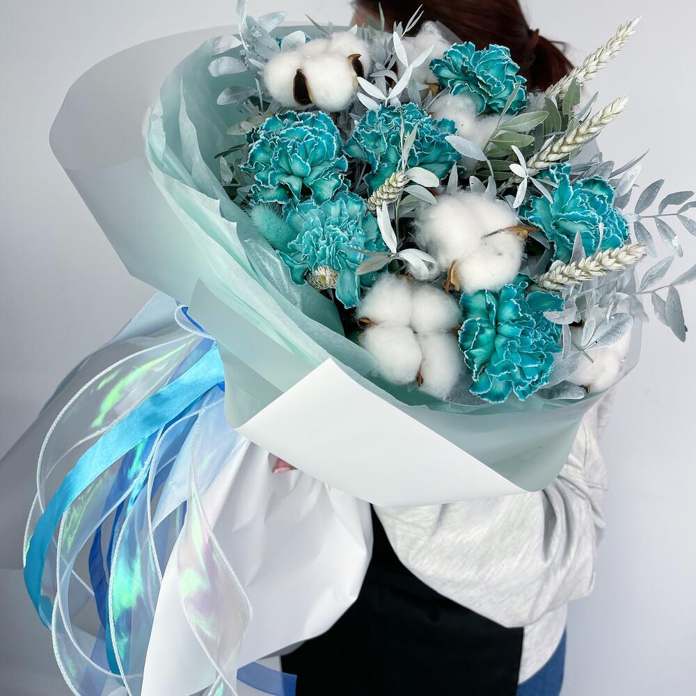 Гвоздика – 7 шт.Лента атласная – 4 шт.Фисташка – 3 шт.Пленка матовая – 4 шт.Хлопок натуральный – 5 шт.Тишью белое – 4 шт.колосок полевой – 5 шт.