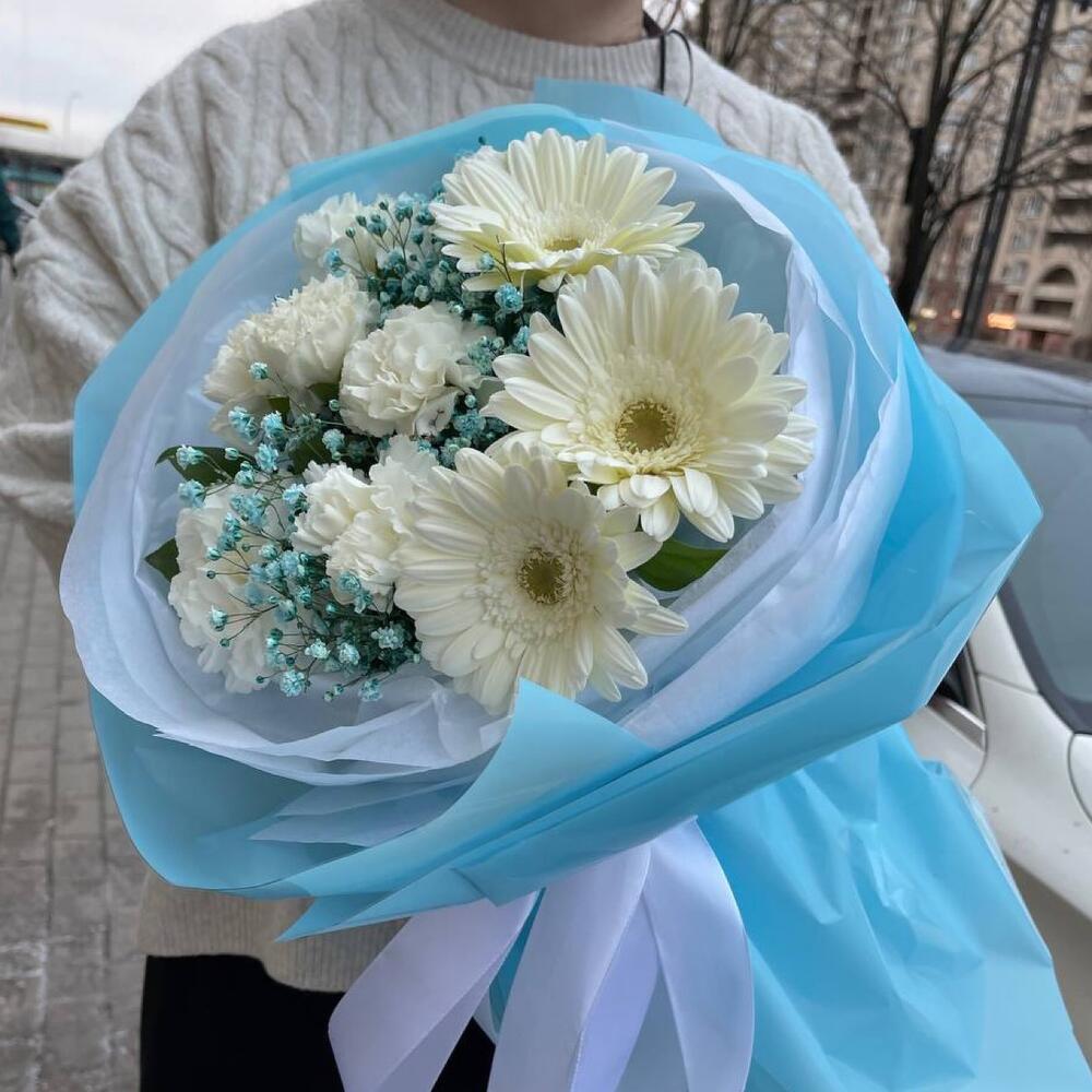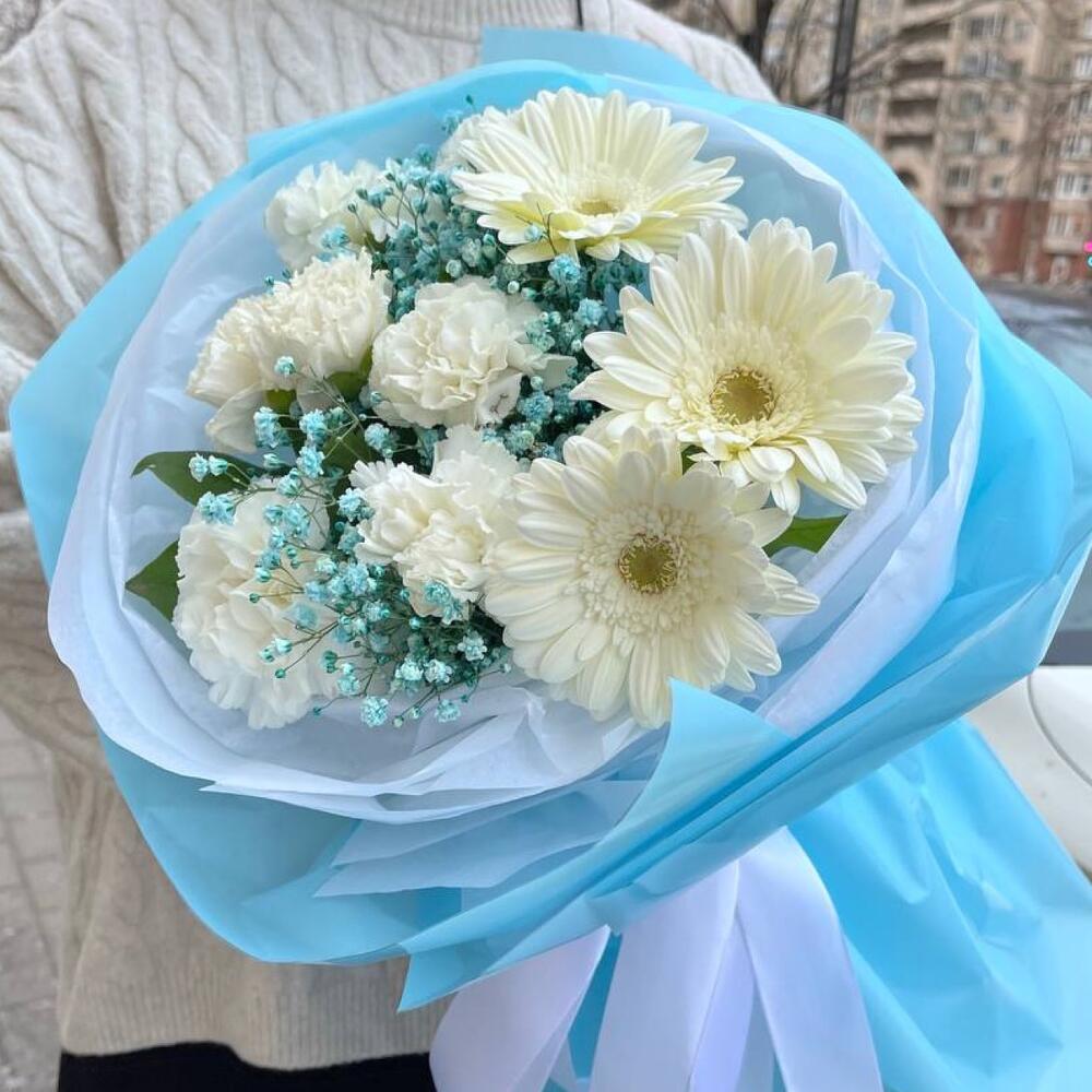 Голубой воздушный букет с герберами и диантусом