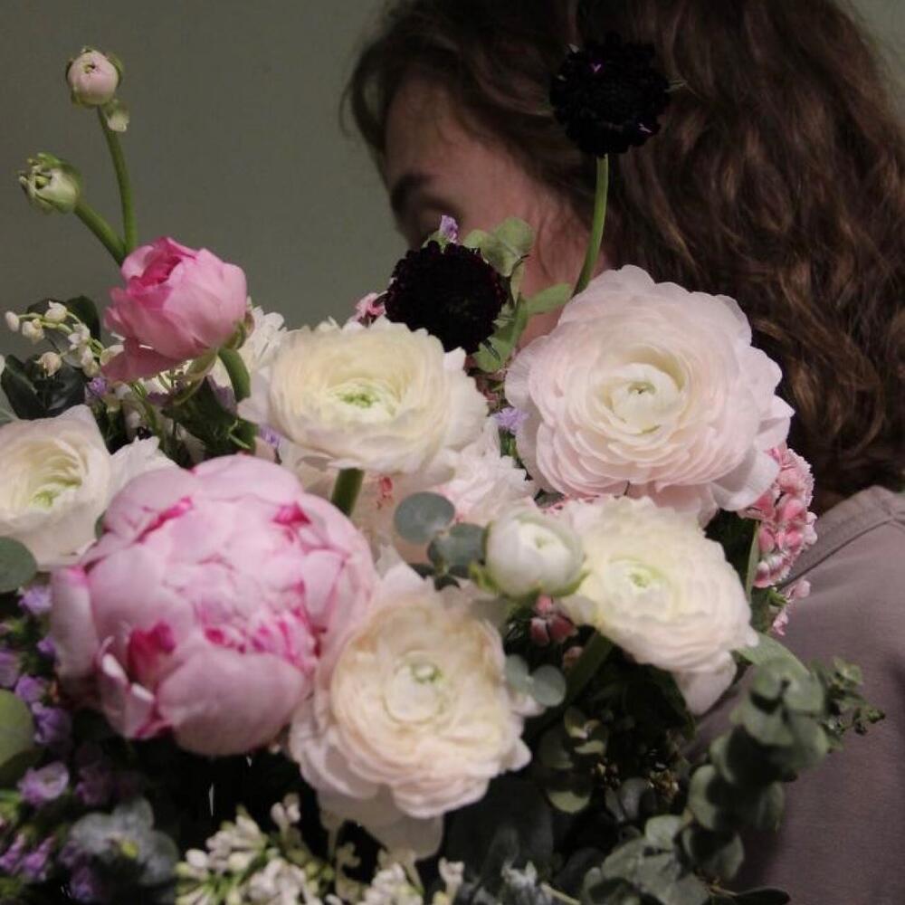 Лукошко из сада с ранункулюсами и пионами