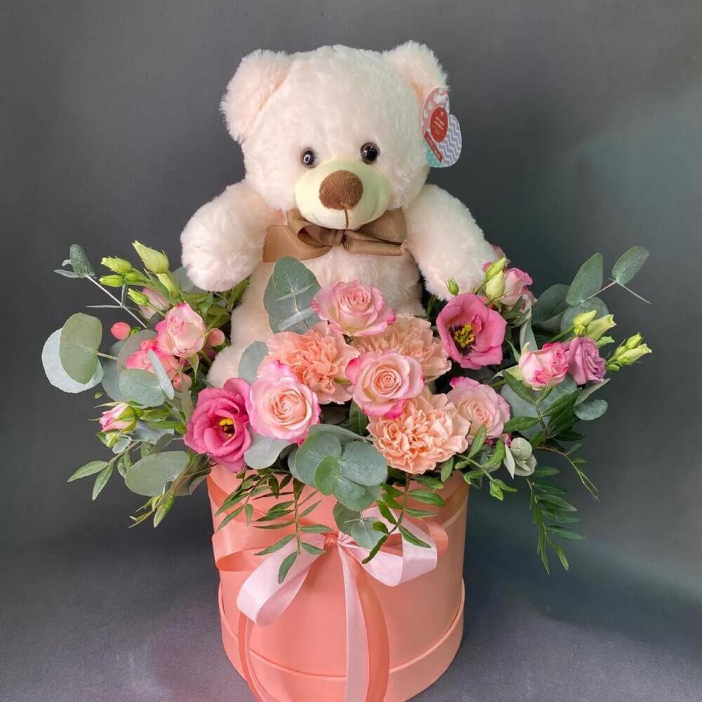 Альстромерия – 1 шт.Гиперикум – 1 шт.Лизиантус – 1 шт.Роза кустовая – 2 шт.Эвкалипт – 3 шт.Диантус – 3 шт.Плюшевый медведь – 1 шт.Шляпная коробка большая vip – 1 шт.