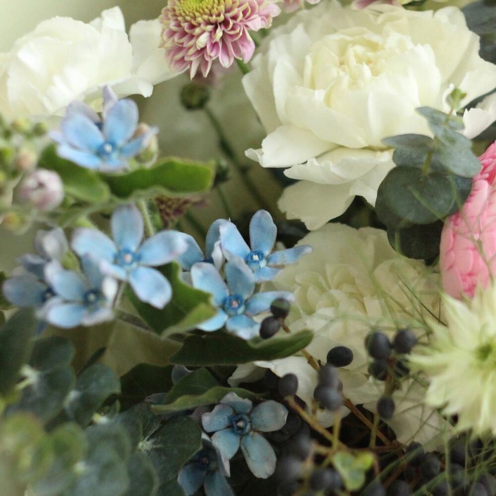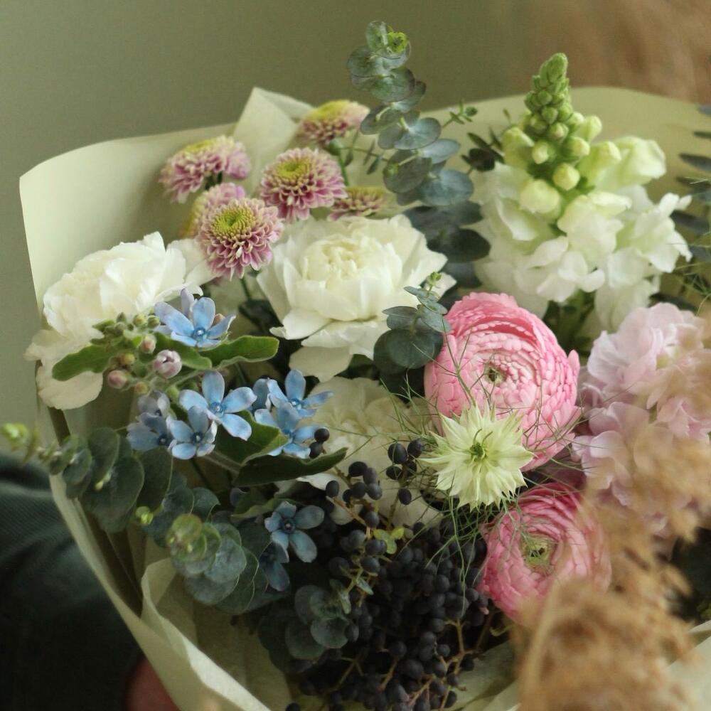 Ранункулюс – 2 шт.Львиный зев – 1 шт.Маттиола – 1 шт.Диантус – 3 шт.Твидия – 2 шт.тмин – 2 шт.Сантини – 1 шт.лигуструм – 1 шт.Эвкалипт – 1 шт.Упаковка – 1 шт.