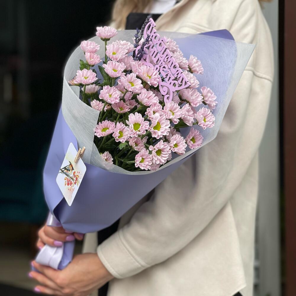 Хризантема Сантини – 5 шт.Лаванда (сухоцвет) – 7 шт.Упаковка – 1 шт.Лента – 1 шт.Открытка мини – 1 шт.Топпер деревянный – 1 шт.