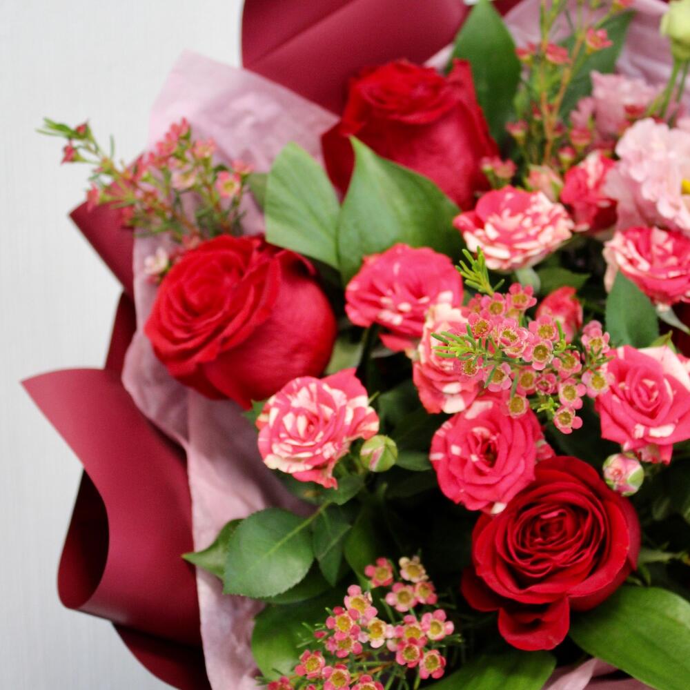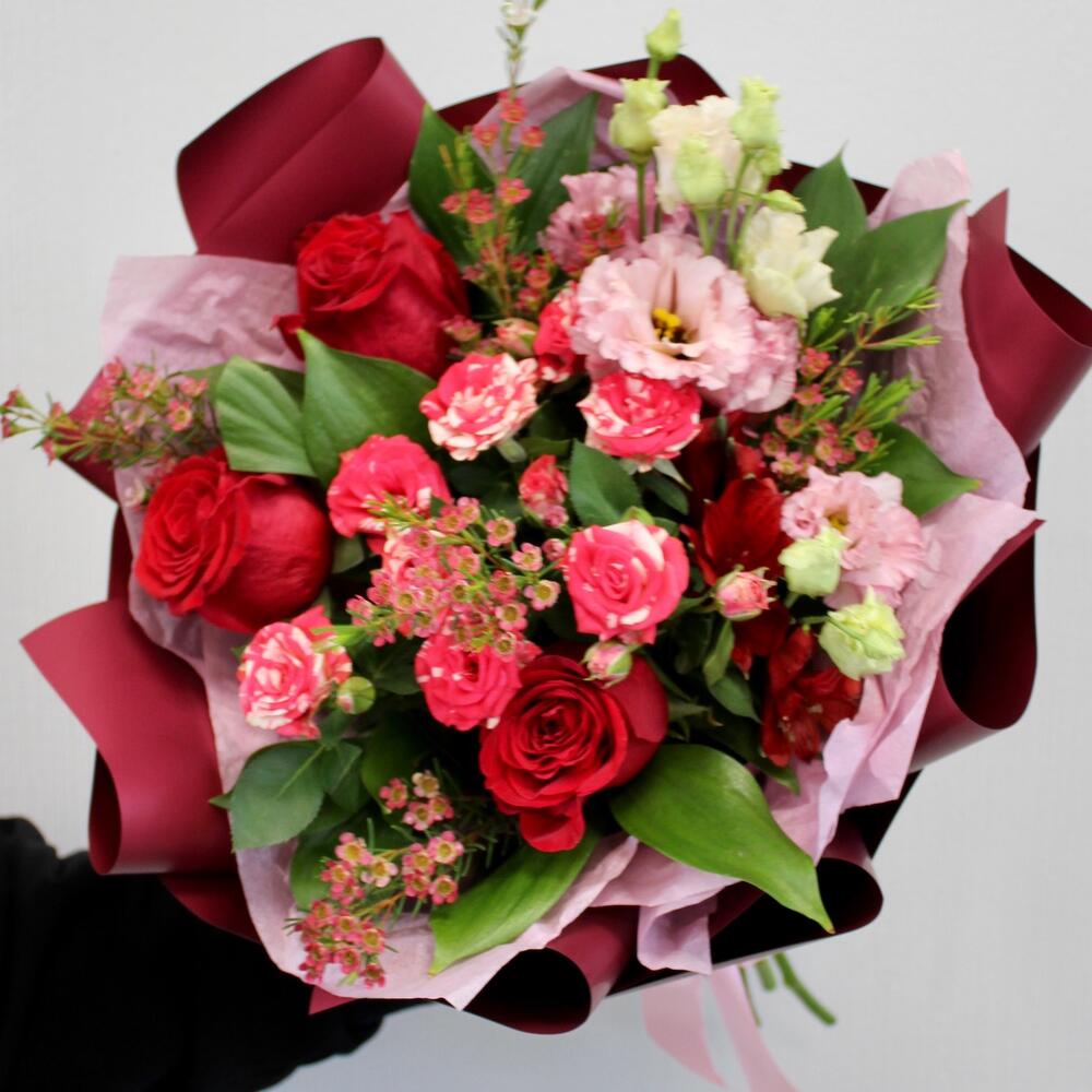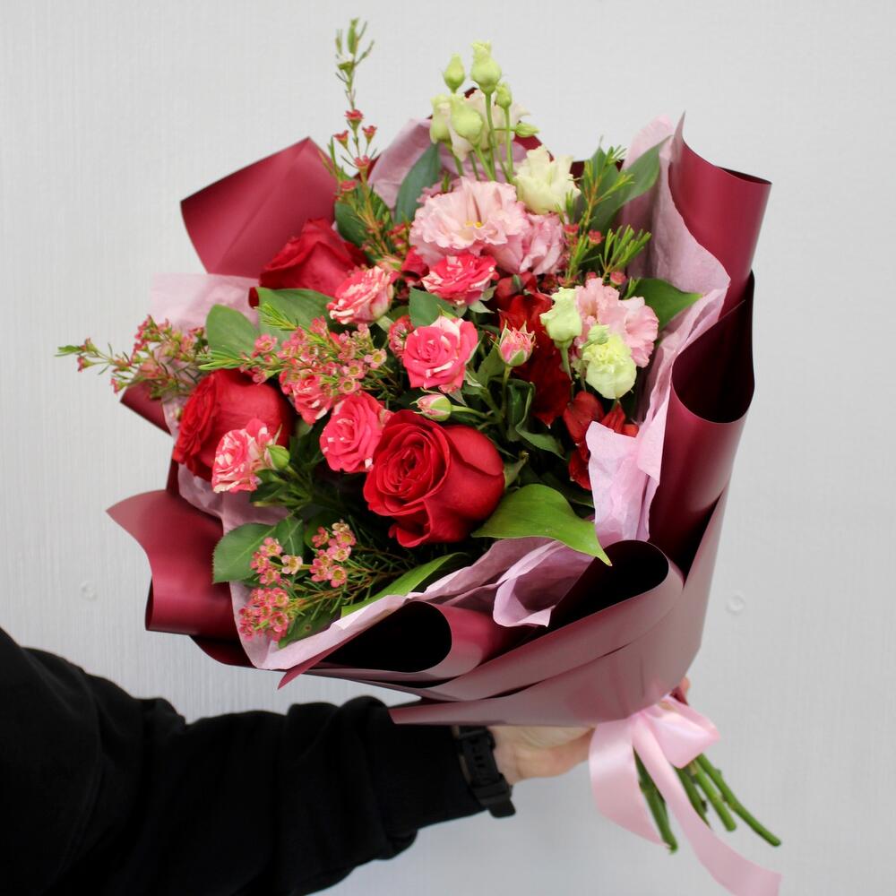 Роза Эквадор – 5 шт.роза кустовая fireworks – 1 шт.Альстромерия – 1 шт.Ваксфлауэр – 1 шт.Упаковка дизайнерская – 4 шт.Лента атласная – 1 шт.эустома махровая – 1 шт.