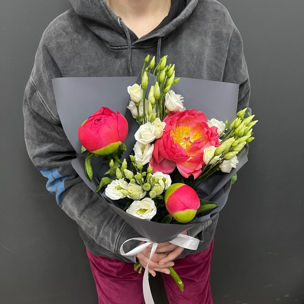 ВЕСНА В ПЕТЕРБУРГЕ премиум букет из пионов и эустомы