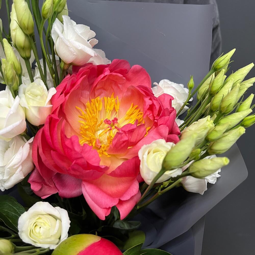 Лизиантус белый – 3 шт.Лента атласная белая – 1 шт.Упаковка корейская пленка – 1 шт.премиум пион Коралл шарм – 3 шт.