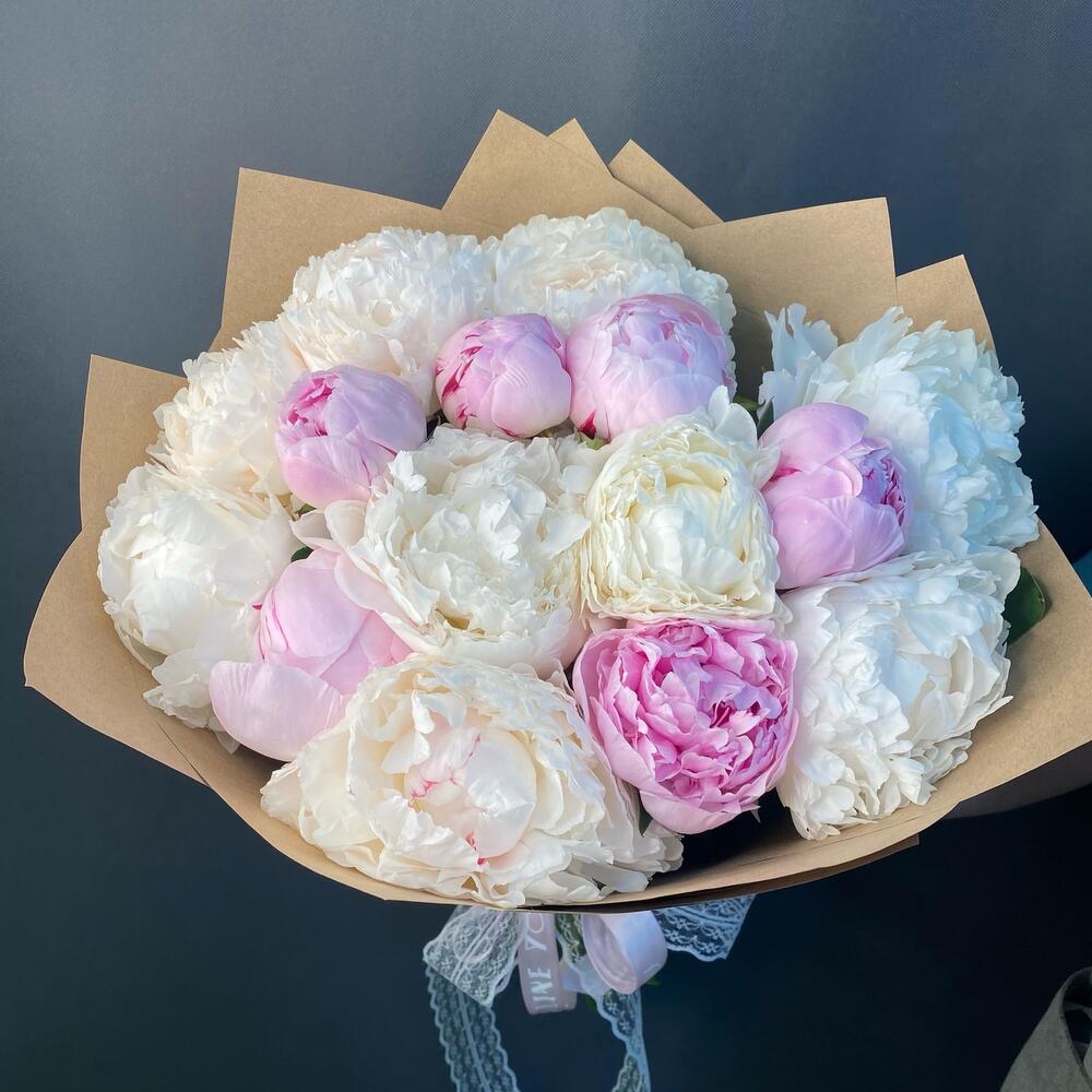 Большой букет из 15 Пионов в крафт бумаге . Выглядит невероятно красиво и нежно . Пломбирные шарики, словно мороженное в красивой обертке.