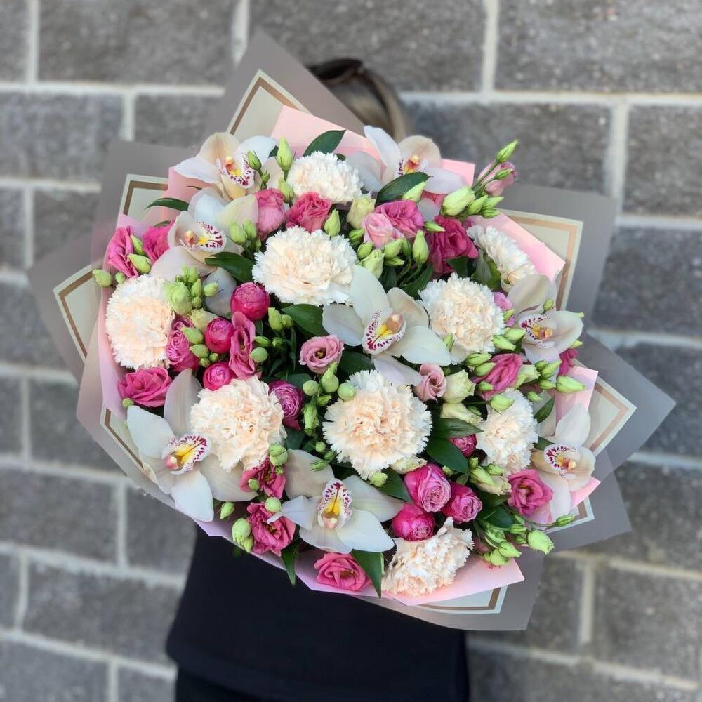 Орхидея Цимбидиум – 8 шт.Диантус – 9 шт.Роза кустовая – 3 шт.Лизиантус – 7 шт.Упаковка дизайнерская – 1 шт.Лента атласная – 1 шт.