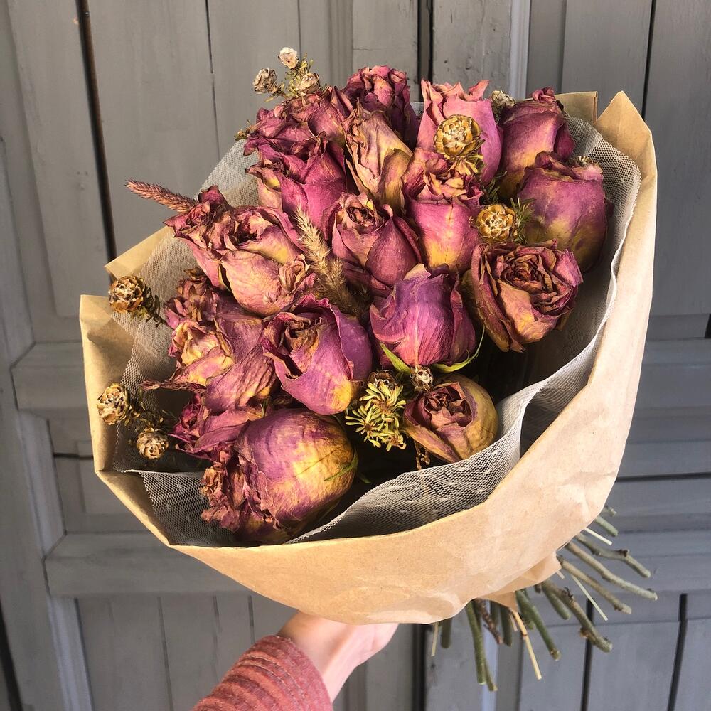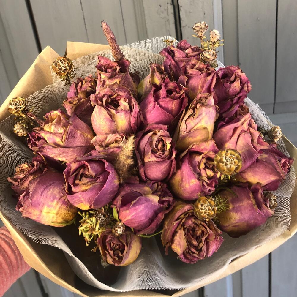 Роза сухоцвет – 29 шт.зелень экзотика – 3 шт.Упаковка дизайнерская – 2 шт.
