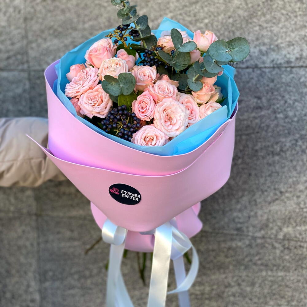Роза кустовая Бомбастик – 9 шт. Вибурнум ягодный – 2 шт. Эвкалипт цинерея – 3 шт. Дизайнерская упаковка – 1 шт.