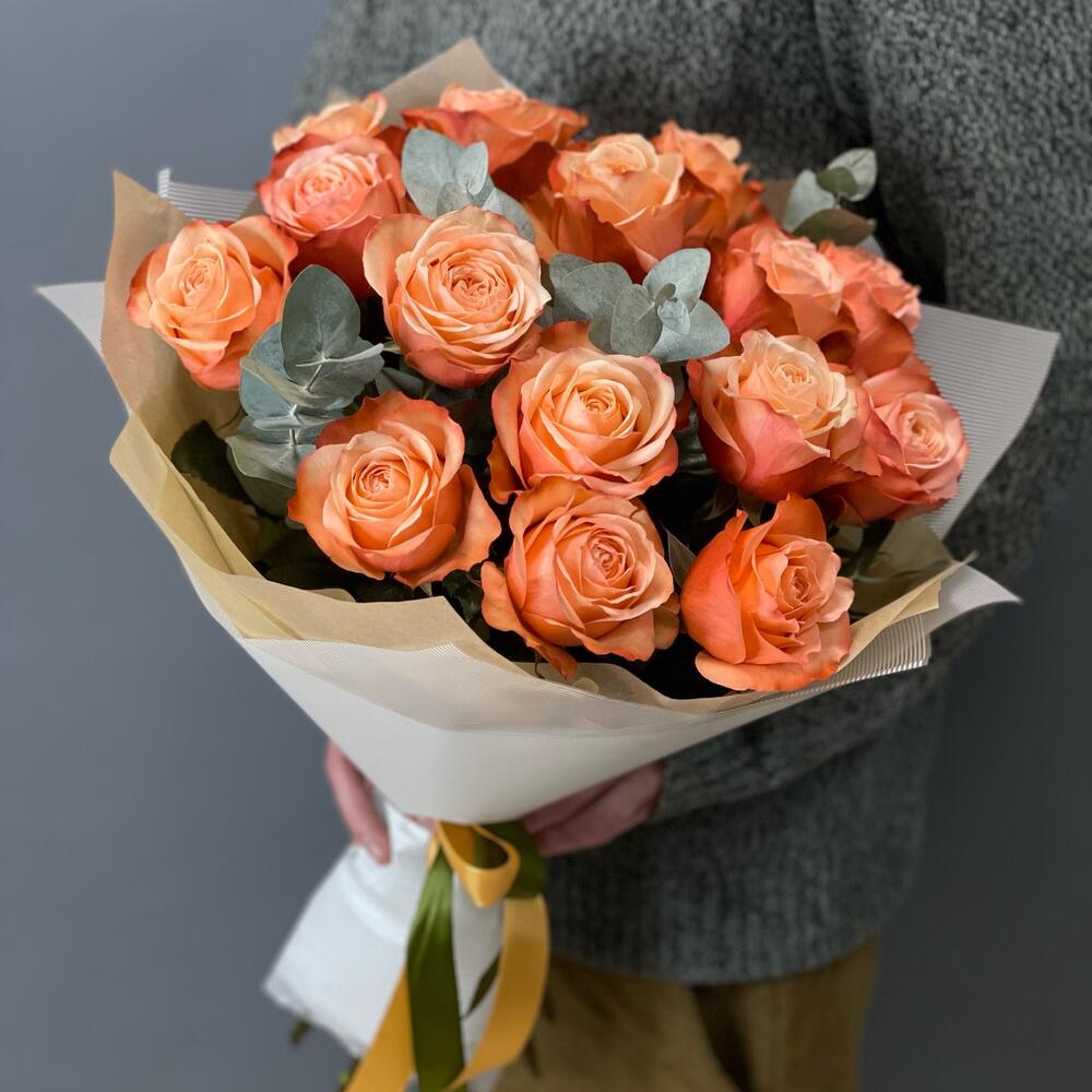 Лента – 1 шт.Эвкалипт – 3 шт.Роза одноголовая – 15 шт.Упаковка дизайнерская – 1 шт.