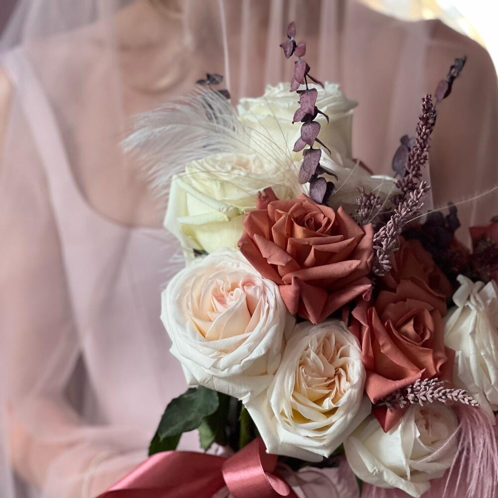 Эвкалипт – 3 шт.Органза – 1 шт.Пионовидная роза – 8 шт.Атласная лента – 2 шт.Одноголовая роза – 7 шт.перо декоративное – 3 шт.сухоцветы пучок – 3 шт.розовая лаванда – 7 шт.