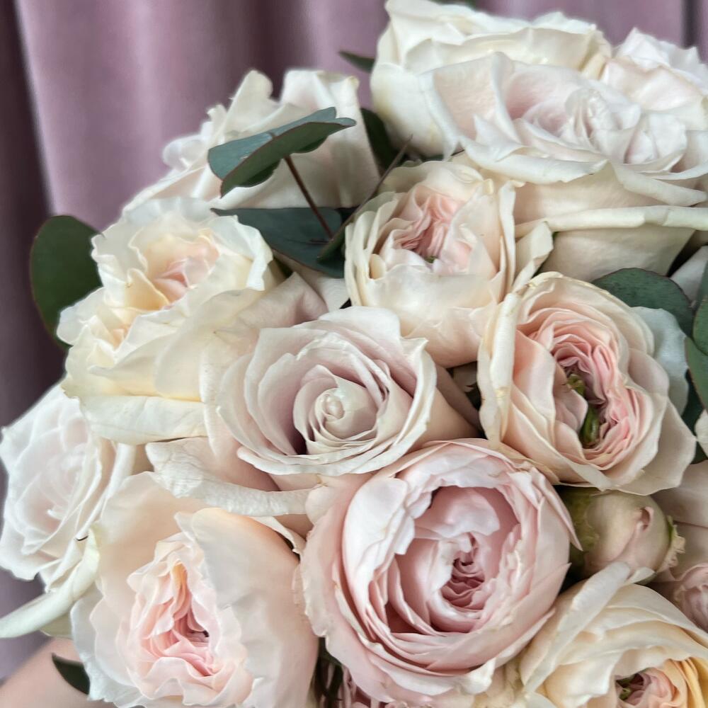 Эвкалипт – 3 шт.Пионовидная роза – 9 шт.Атласная лента – 2 шт.Кустовая пионовидная роза – 7 шт.Одноголовая роза – 13 шт.