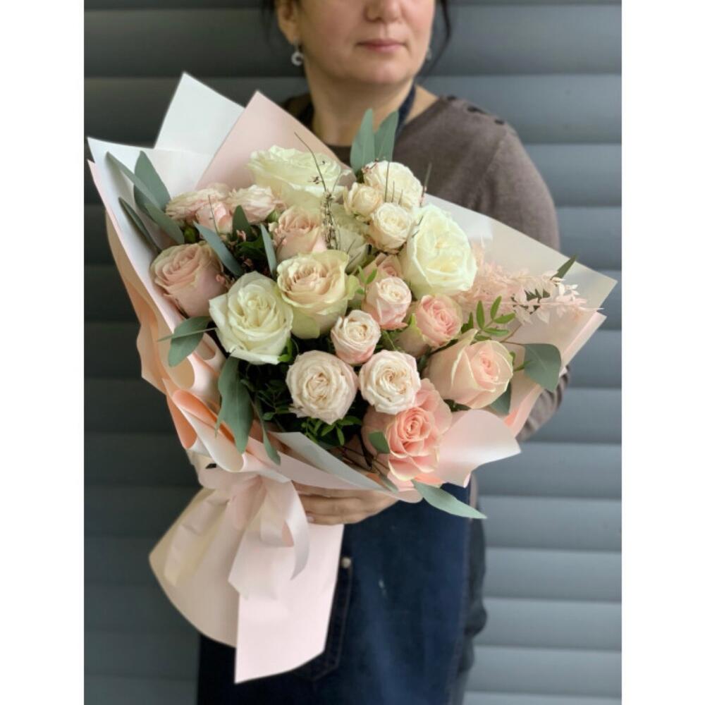 Альстромерии, Гвоздики, Кустовые розы, Лизиантусы, Розы, Хризантемы