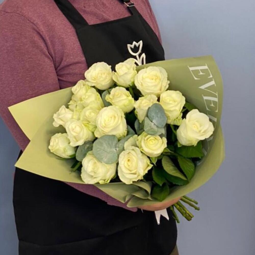 Роза белая – 17 шт.Эвкалипт – 3 шт.Упаковка – 1 шт.Лента атласная – 1 шт.