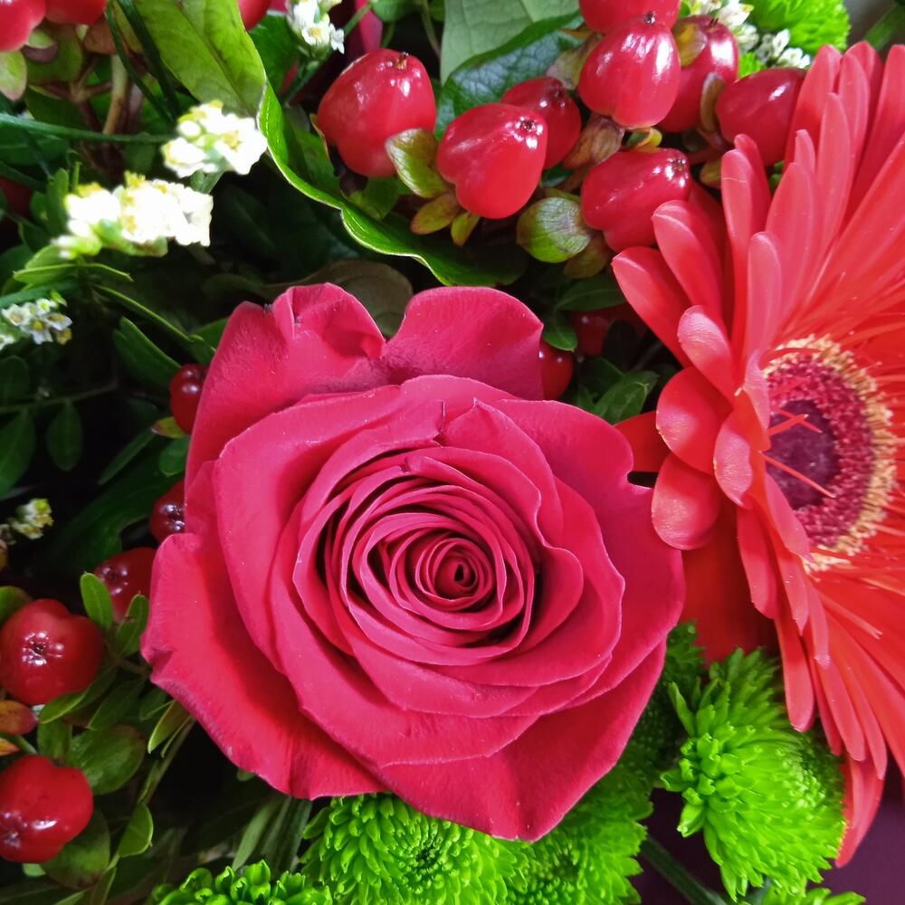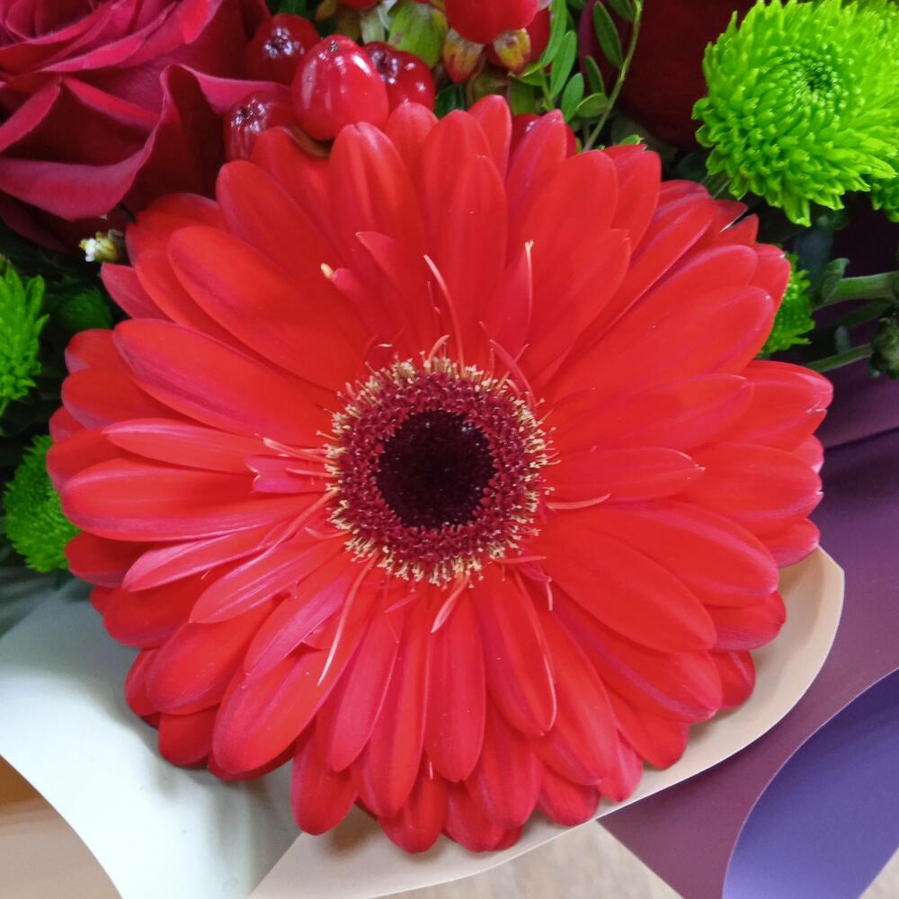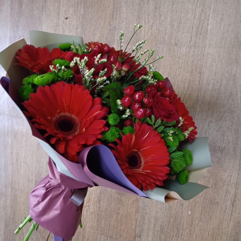 Гербера – 5 шт.Роза Эквадор – 3 шт.Сантини – 5 шт.Гиперикум красный КУСТОВОЙ – 3 шт.Лимониум – 1 шт.Фисташка пучок – 1 шт.Упаковка дизайнерская – 1 шт.