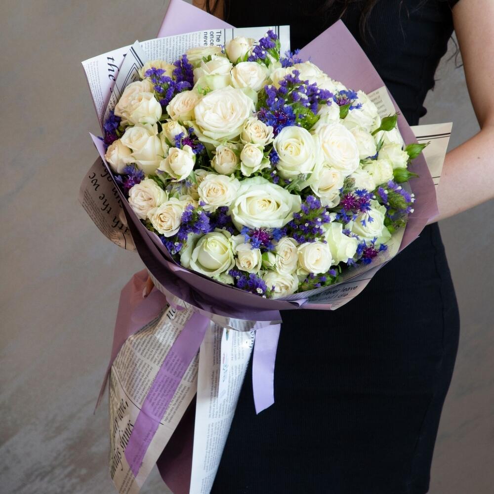 Цветы: роза, кустовая роза, лимониум.