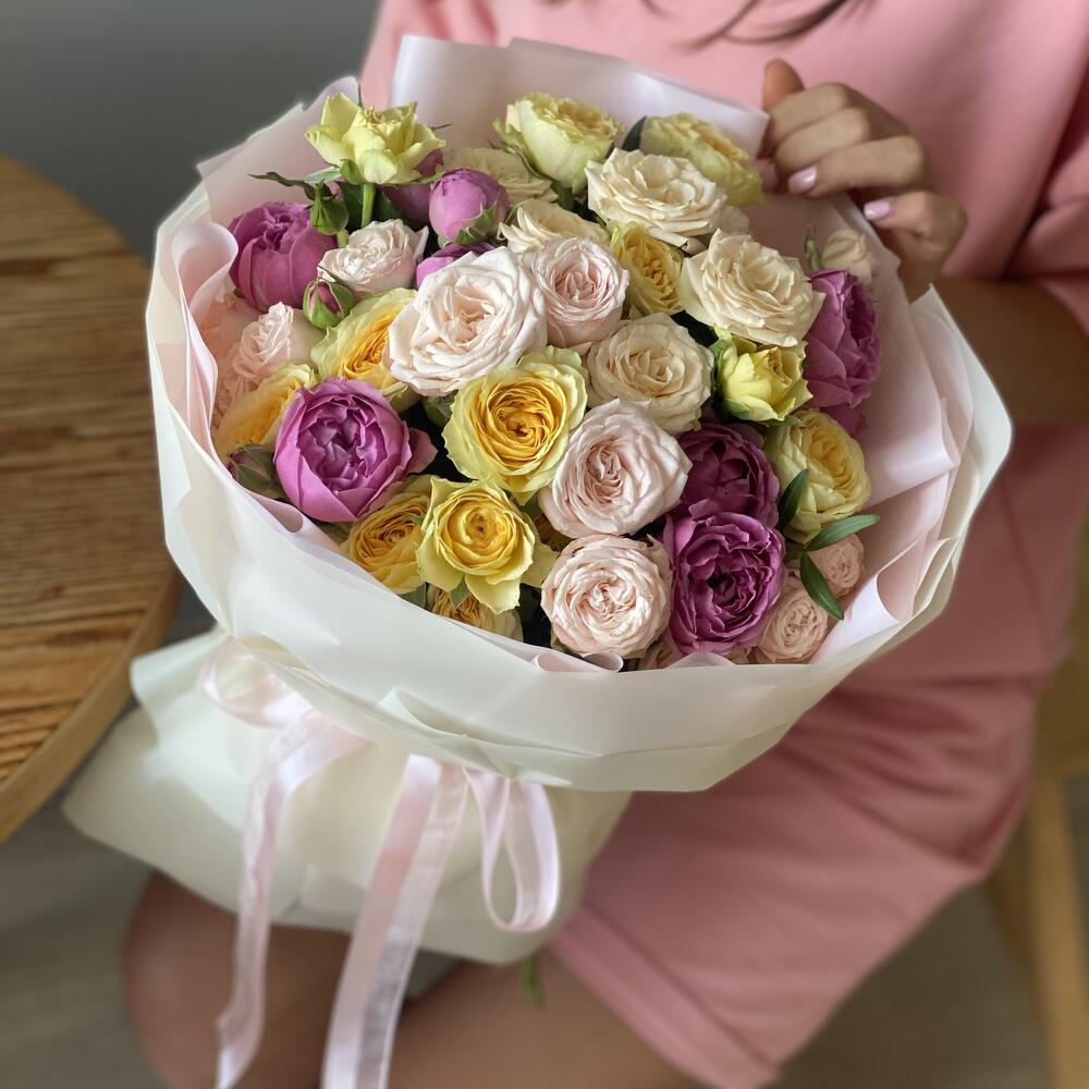 Сборный букет из микса кустовых роз в оформлении!
