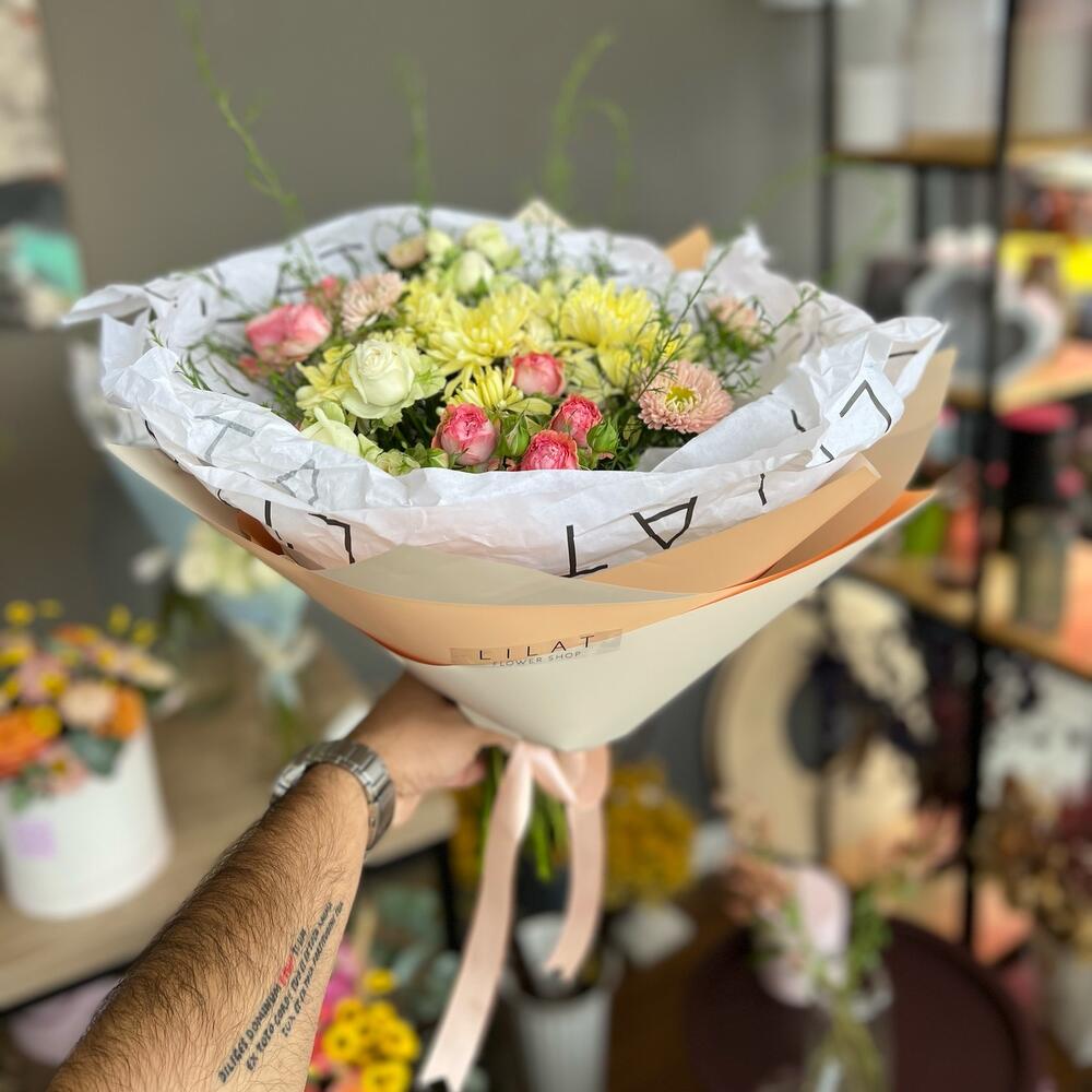 Хризантема – 5 шт. Кустовая роза – 3 шт. Зелень – 3 шт.
