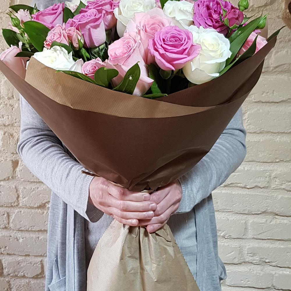 Букет комбинация из разных нежных и ярких оттенков розовых и белых роз, с добавлением кустовых. К подарку обычно прикладывается наша карточка с красиво напечатанным текстом вашего послания. К букетам обычно прилагается рекомендация по уходу и объяснением причин. При доставке температура в машине курьера контролируется нами в зависимости от сезона.