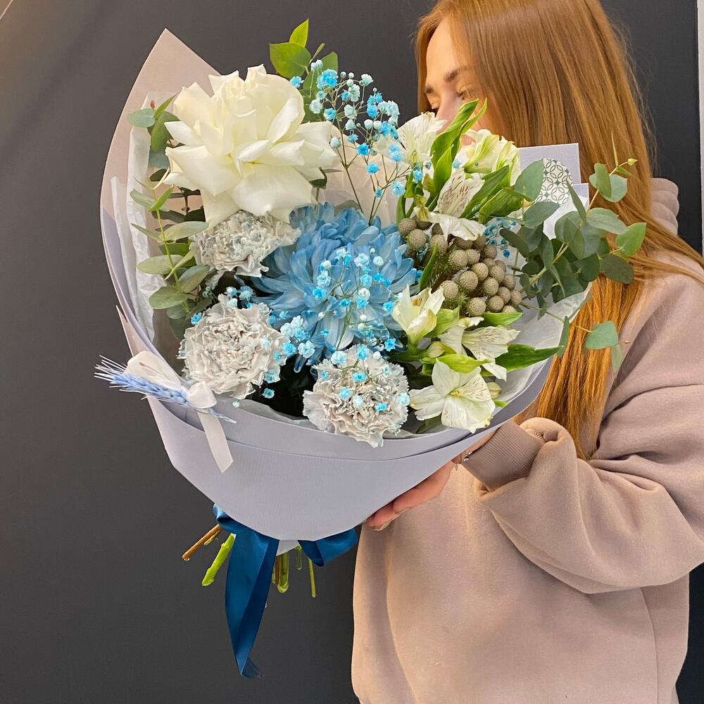 Роза Эквадор – 1 шт.Хризантема – 1 шт.Гвоздика – 3 шт.Альстромерия – 2 шт.Бруния – 1 шт.Эвкалипт – 1 шт.Гипсофила – 1 шт.