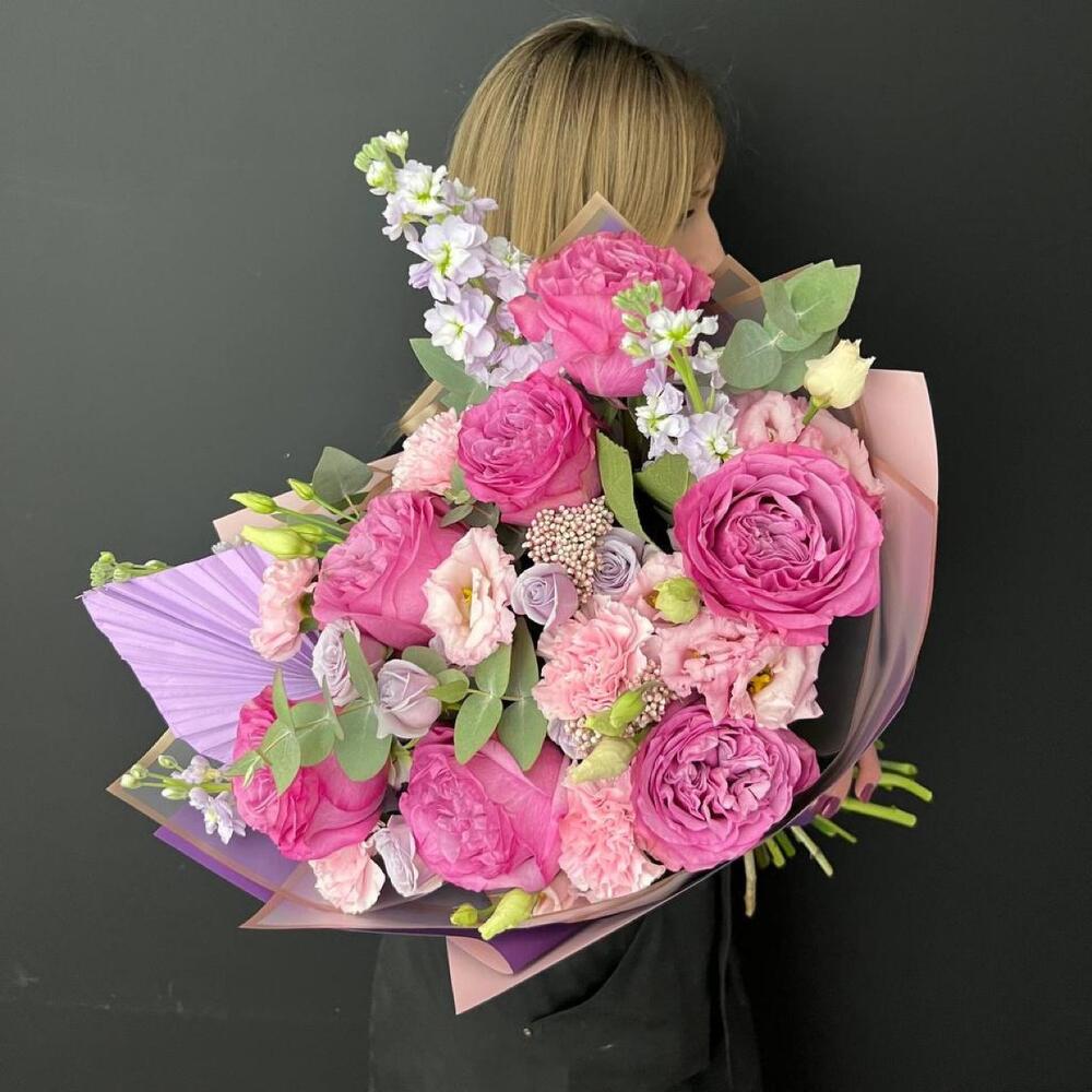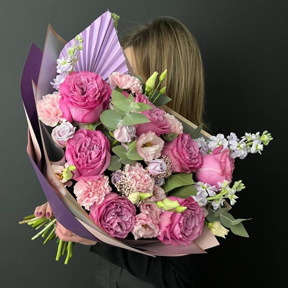 Лизиантус – 2 шт.Маттиола – 3 шт.Озотамнус – 2 шт.Роза кустовая – 3 шт.Эвкалипт – 2 шт.Диантус – 5 шт.Упаковка дизайнерская – 3 шт.Лист пальмы – 1 шт.Эквадор роза – 7 шт.