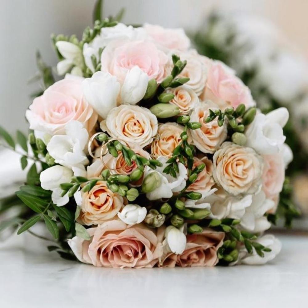 роза белаякремовая эквадор – 11 шт.Фрезия белая – 11 шт.кустовая роза кения кремовая – 3 шт.Фисташка пучок – 5 шт.Лента атласная – 1 шт.