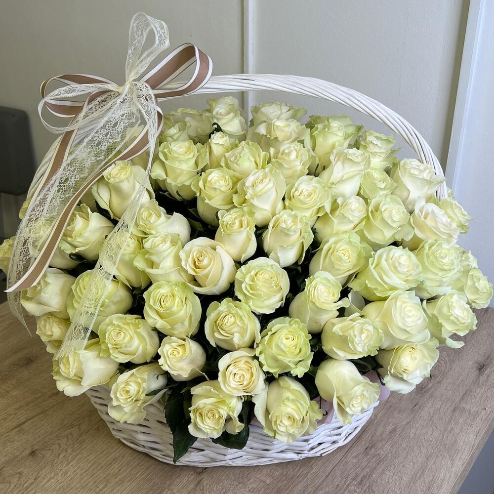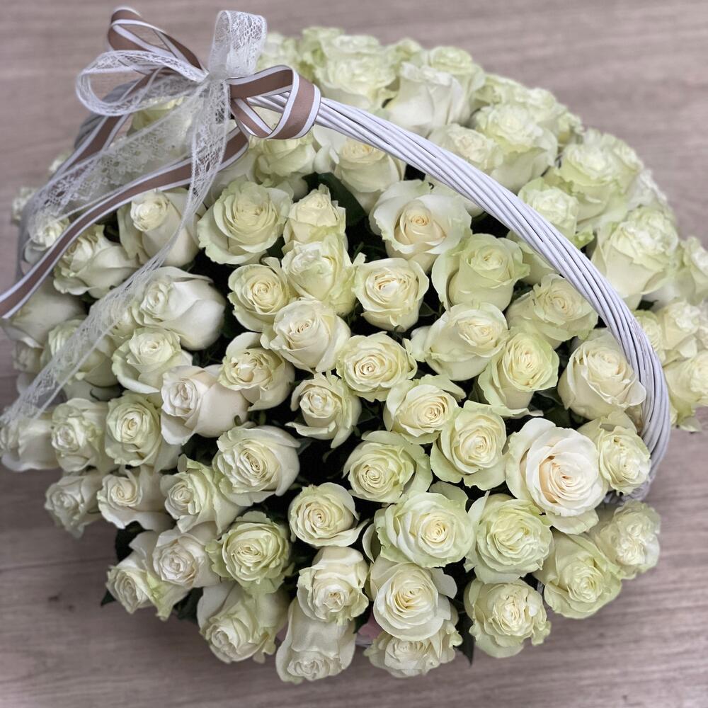 Роза белая мондиаль – 101 шт. Корзина – 1 шт. Оазис – 6 шт. Оформление – 1 шт.