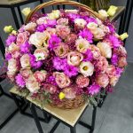 Роза – 29 шт. Хризантема – 33 шт. эустомы – 11 шт. зелень декоративная – 5 шт. Корзина плетеная – 1 шт.