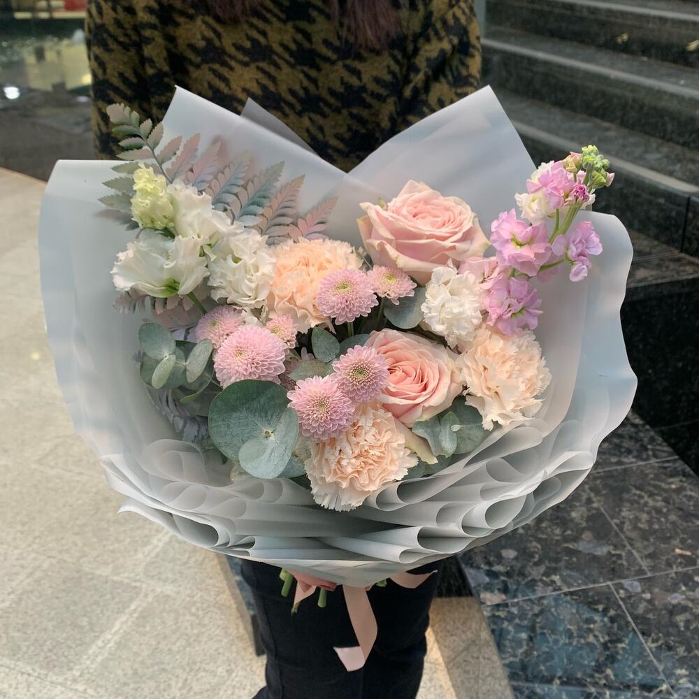 Роза одноголовая – 2 шт.Диантус – 3 шт.Сантиния – 1 шт.Маттиола – 1 шт.папоротник ветка – 1 шт.Эустома – 1 шт.