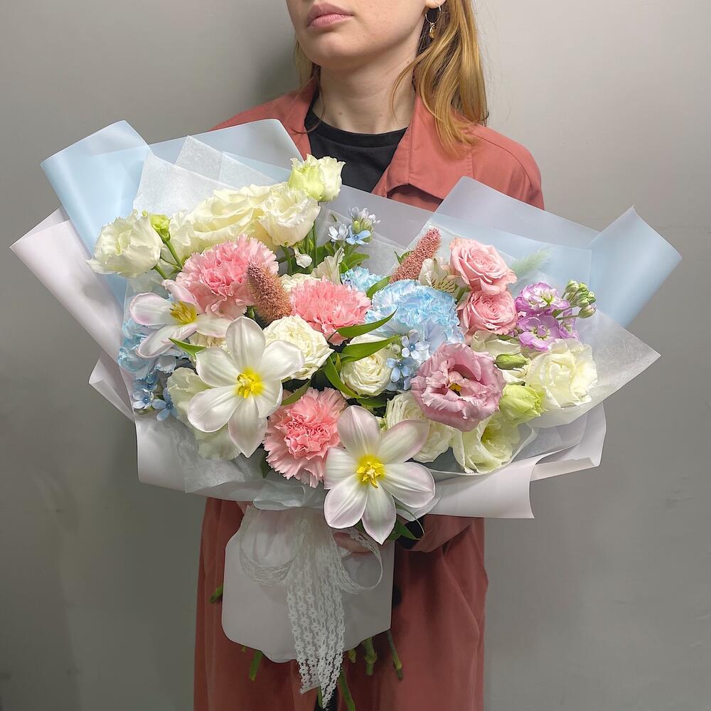 Альстромерия – 1 шт.Лизиантус – 3 шт.Роза кустовая – 2 шт.Тюльпан – 3 шт.Диантус – 6 шт.Роза белая – 1 шт.Роза кустовая пионовидная – 1 шт.Оксипеталум – 3 шт.Упаковка дизайнерская – 1 шт.Лагурус – 3 шт.сетарея – 2 шт.