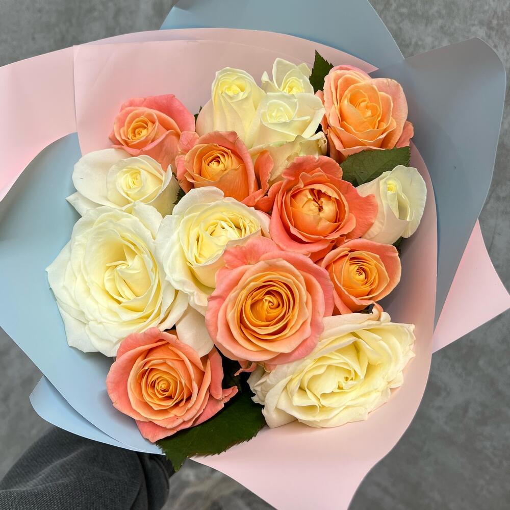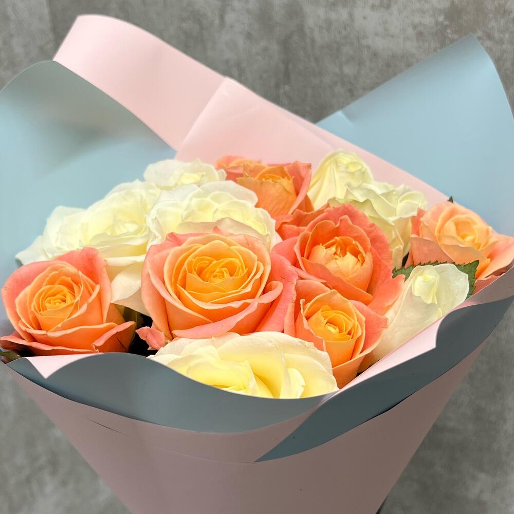 белая роза аваланж – 8 шт.Роза Мисс Пигги – 7 шт.Упаковка дизайнерская – 1 шт.Лента – 1 шт.