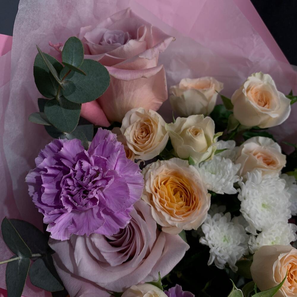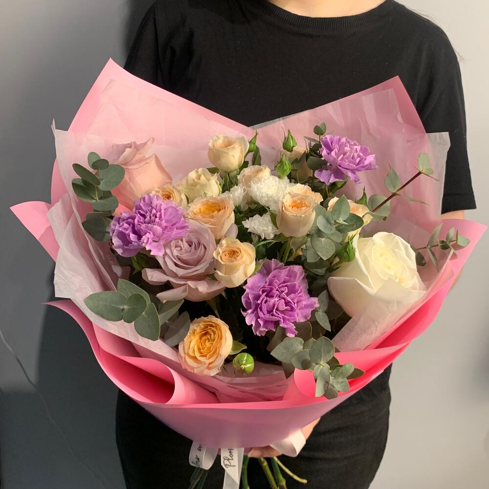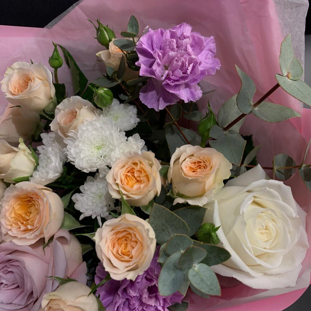 Гвоздики, Кустовые розы, Лизиантусы, Пионовидные розы, Розы