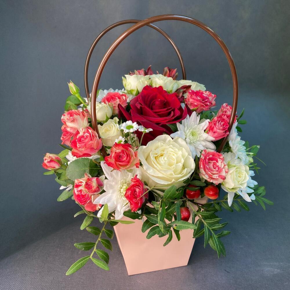 Роза Эквадор – 3 шт.Роза кустовая – 3 шт.Эустома – 1 шт.Альстромерия – 1 шт.Хризантема кустовая – 1 шт.Фисташка – 2 шт.Сумочка – 1 шт.Оазис флористический – 1 шт.
