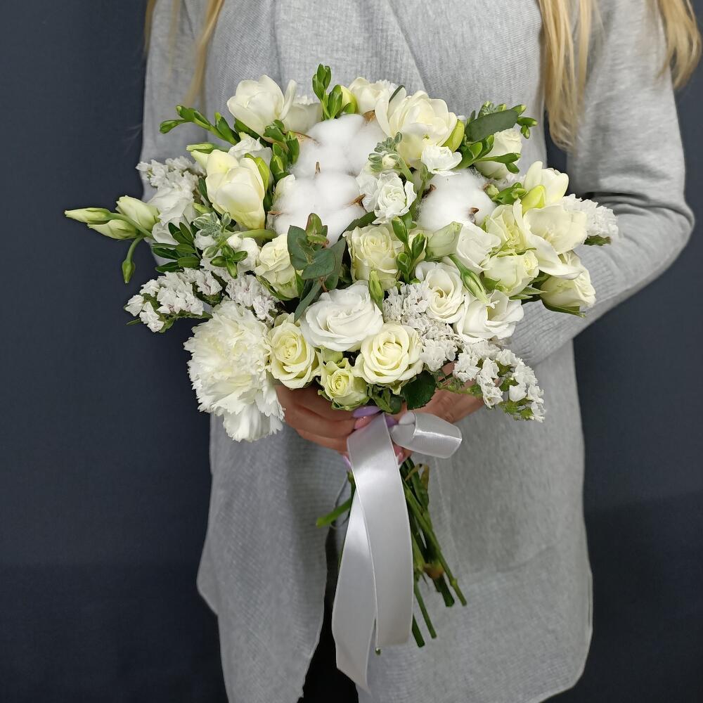 Хлопок – 3 шт.Фрезия – 10 шт.Роза кустовая – 5 шт.Лизиантус – 3 шт.Статица – 2 шт.Гвоздика – 1 шт.Эвкалипт – 1 шт.Лента атласная – 3 шт.