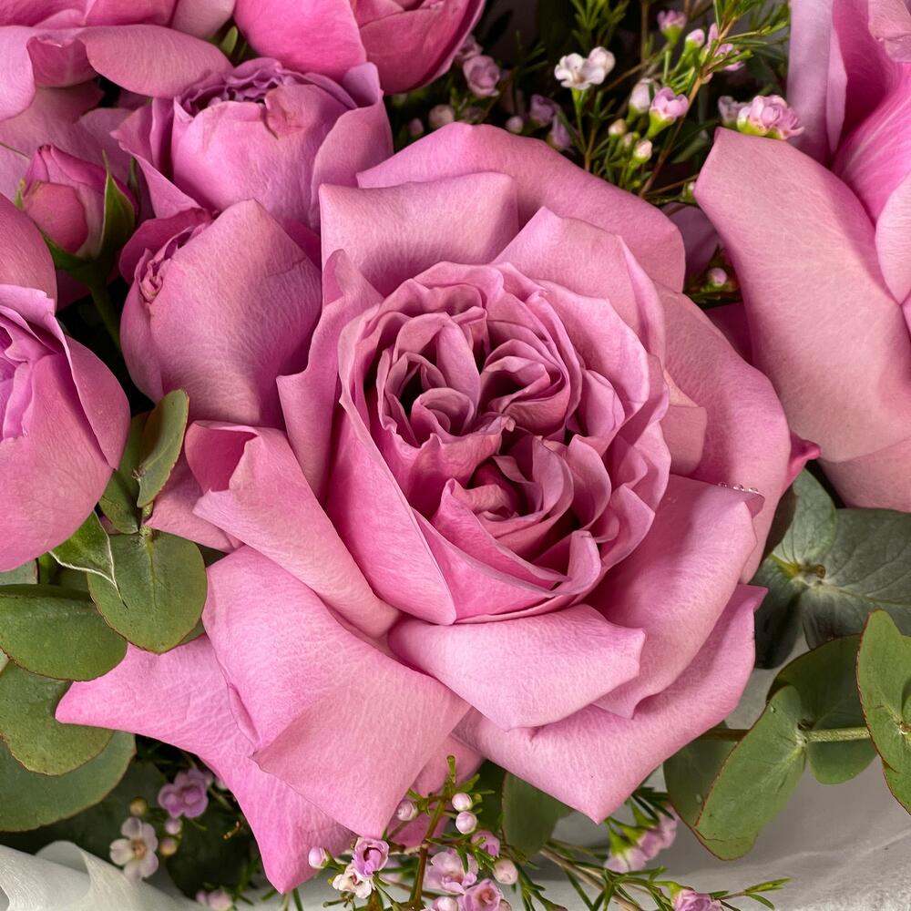 Ваксфлауэр – 1 шт.Лента – 2 шт.Маттиола – 1 шт.Эвкалипт – 1 шт.Роза одноголовая – 3 шт.Фисташка – 2 шт.Роза кустовая пионовидная – 2 шт.Упаковка дизайнерская – 1 шт.