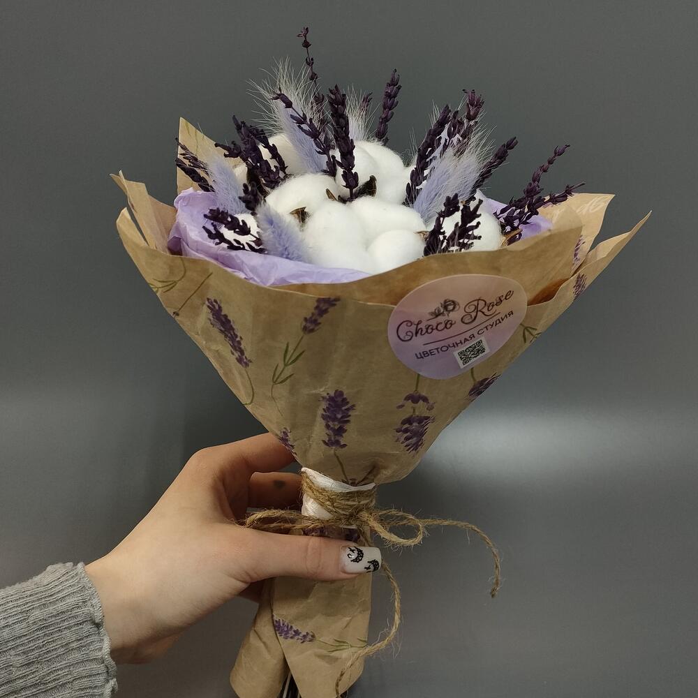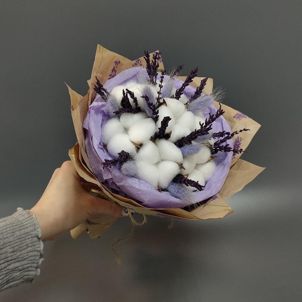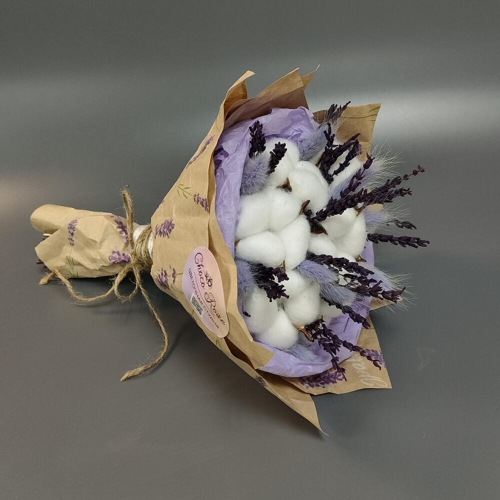 Хлопок искусственный – 7 шт.лаванда стабилизированная пучок – 1 шт.Лагурус – 11 шт.Тишью – 1 шт.Крафт – 1 шт.