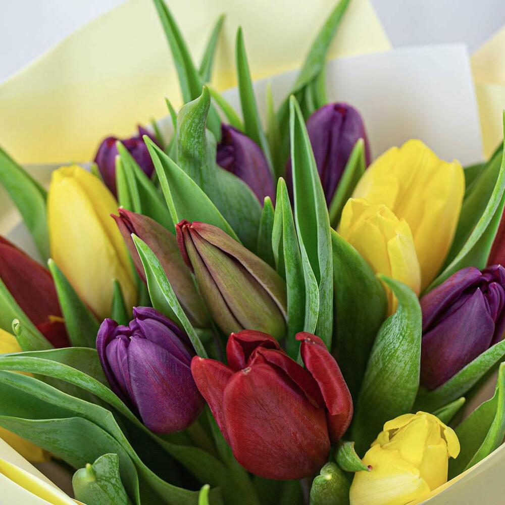 Букет из 15 тюльпанов стандарт яркий микс в упаковке