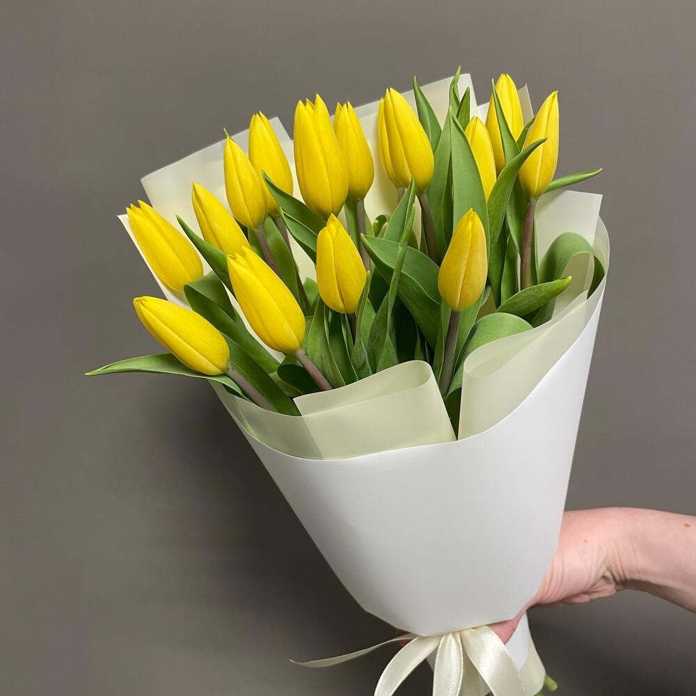 Лента атласная – 1 шт.Упаковка дизайнерская – 1 шт.Желтый тюльпан – 12 шт.