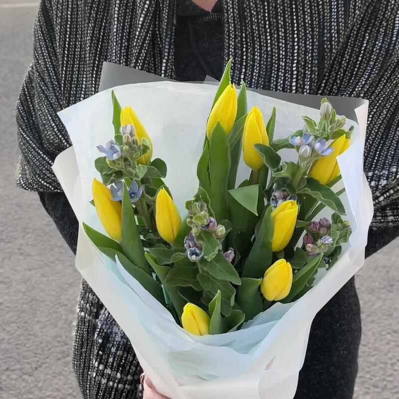 ЯРКАЯ ВЕСНА из жёлтых тюльпанов и голубой твидии